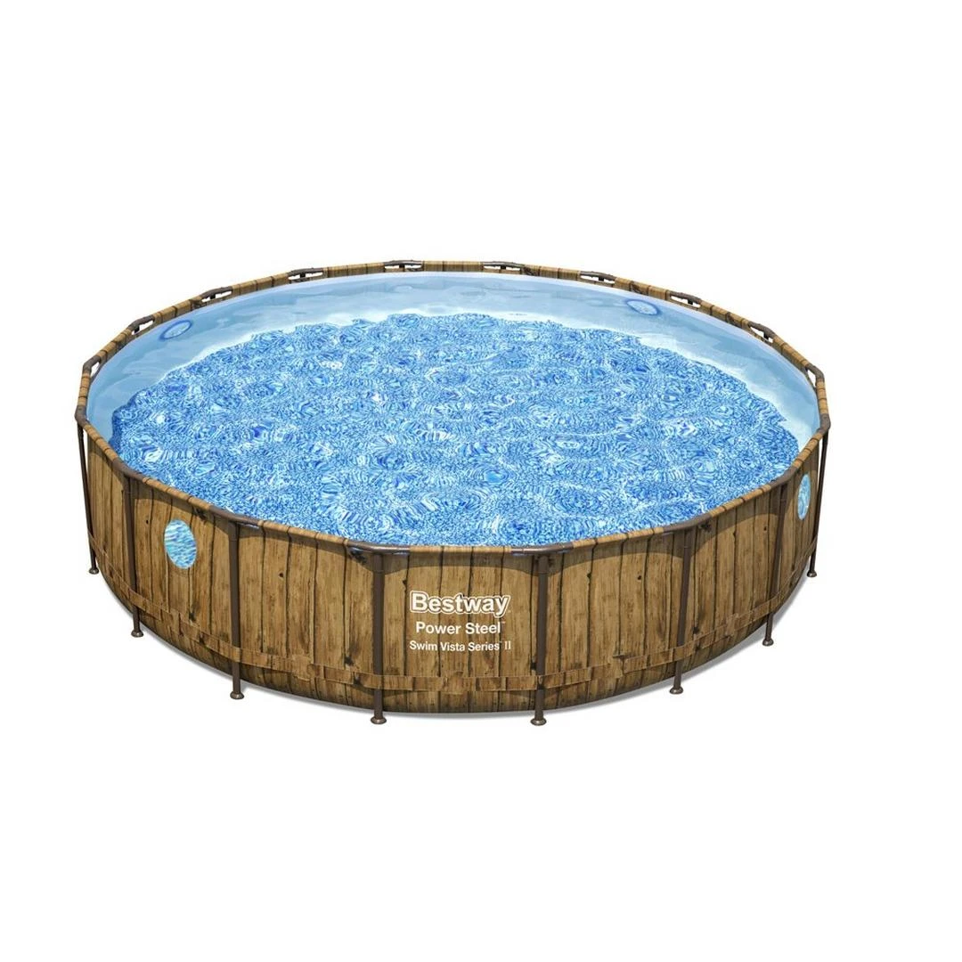 The Bestway Power Steel Swim Vista Round Soft Sided Above Ground Pool is easy to set up and built to last. The corrosion-resistant steel frame is equipped with Bestway’s Seal & Lock System for a sturdy and secure pipe connection. The Tritech pool liner is made of durable material that is reinforced for strength and puncture-resistance. Plus, the outside of the liner is printed with a realistic stone pattern to create a perfect fit in your beautiful backyard.