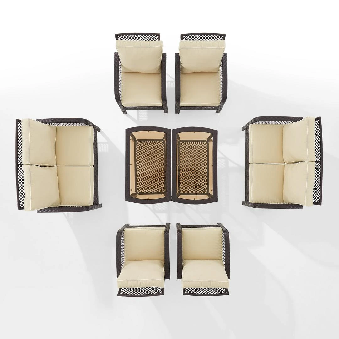 Crosley Tribeca 8-Piece Outdoor Wicker Seating Set, in Brown wicker with Sand colored cushions. The Tribeca Collection from Crosley is equally suited for a casual get together or a big event. Sturdy and stylish resin wicker furniture is comfortable, easy to maintain, and built to last for many summers seasons.