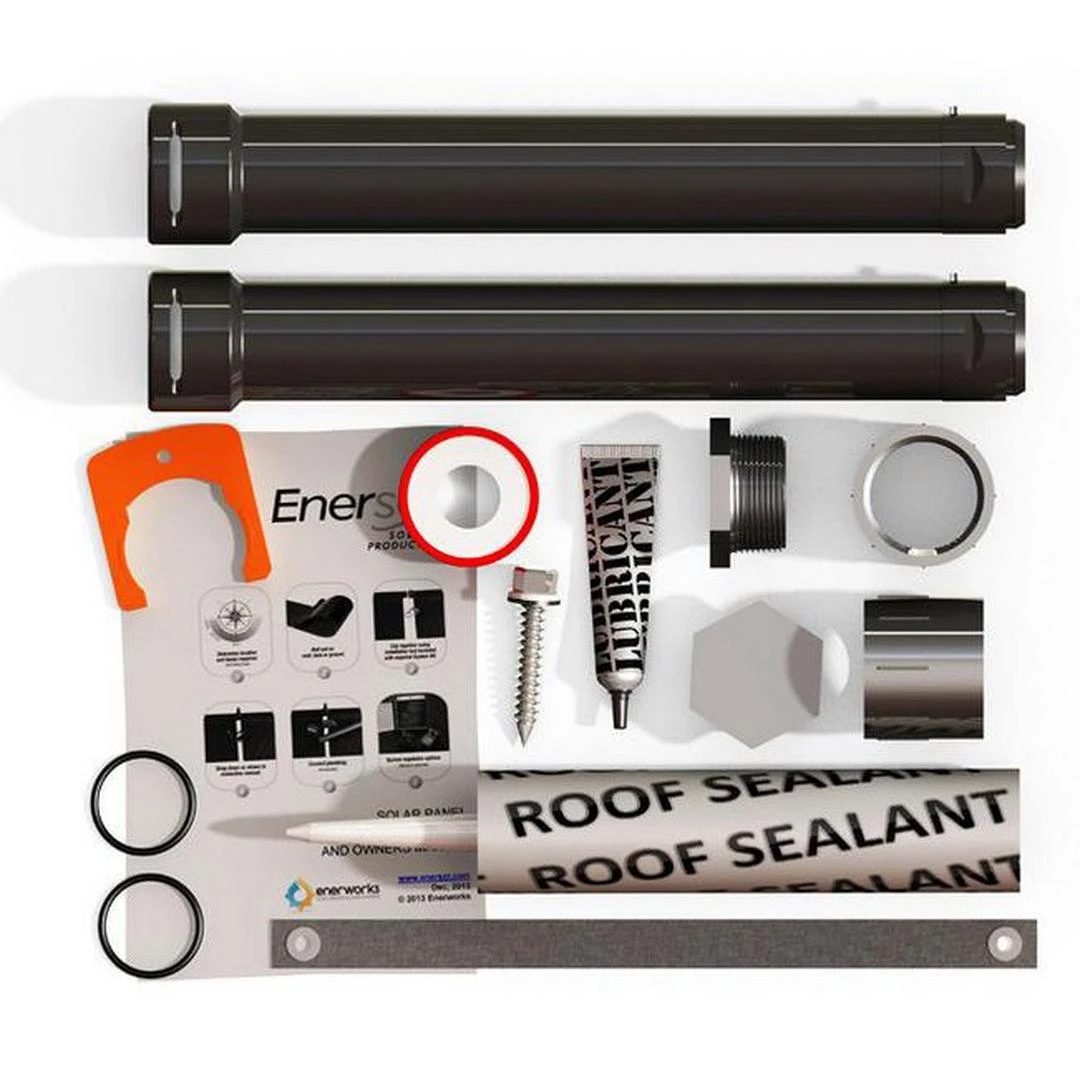 Including the installation guide, DVD, warranty card, installation tool, o-rings, lubricant, header end connectors, sealant, and end caps, this Enersol Solar Pool Heater System Kit completes your solar heater set up.