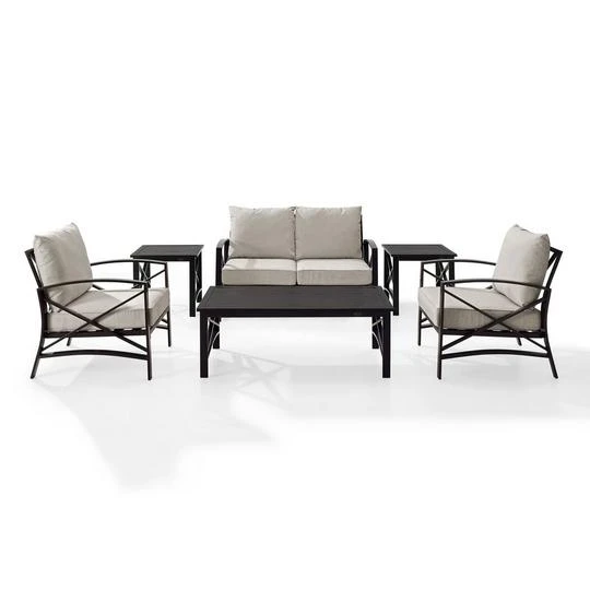 Add simple elegance to your outdoor area with the Kaplan outdoor furniture collection. This 6-piece seating set for four people is made with premium steel covered with an electrostatically applied oil bronze finish to protect the steel against corrosion. The cushions have moisture-resistant and UV-resistant covers to protect against fading, and the fabric resists staining, but can be removed for cleaning if needed.