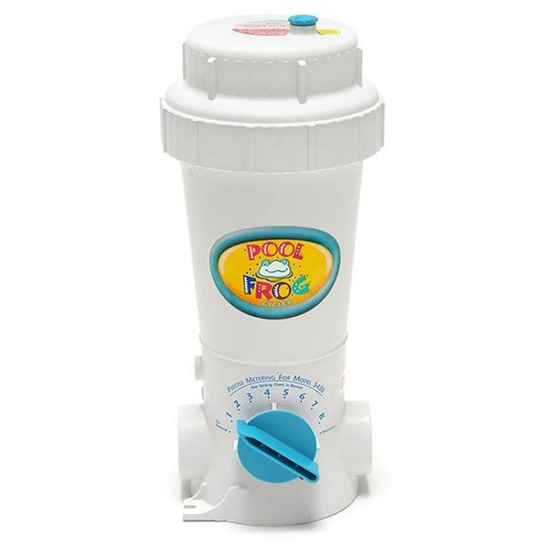 First The Pool FROG Cycler serves as a water treatment center and controls the flow of water through the system, meaning no extra plumbing, electricity, or headaches. The patented Control Dial on the front of the Cycler lets you manage the amount of water flowing through the system. The erosion design of this system continuously dispenses chlorine at a precise low level (only 0.5 is needed). Once you’ve determined the correct setting for your pool, set it and forget it for weeks at a time.