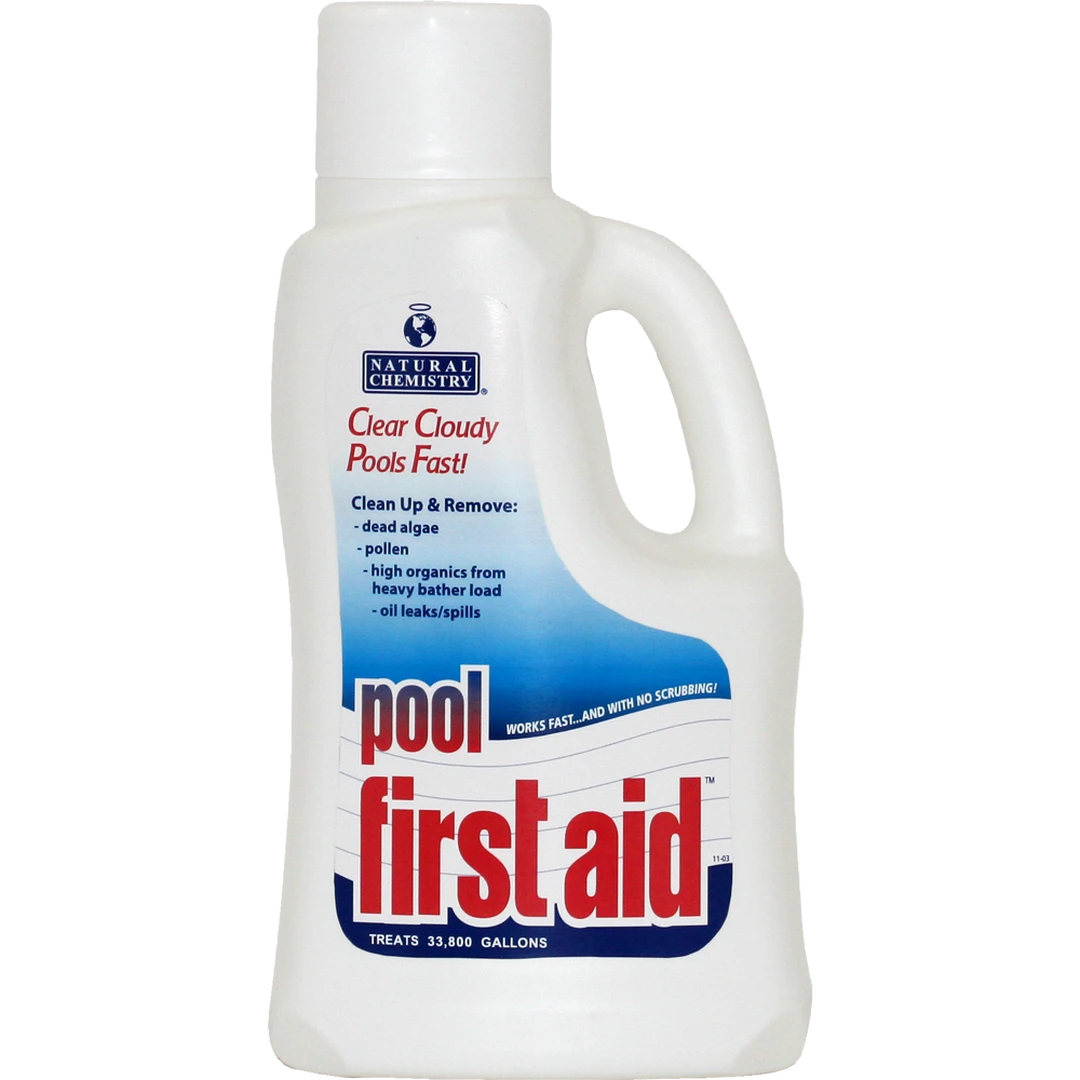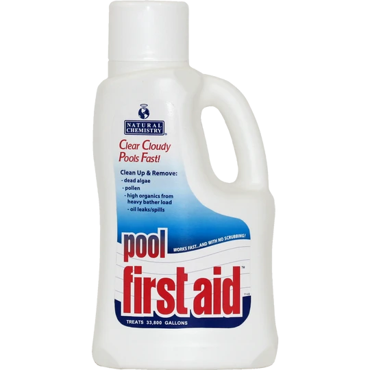 Natural Chemistry Pool First Aid combines powerful SMARTZyme technology with an organic clarifier to quickly fix pool water problems. Pool First Aid will: Clean water of dead algae, pollen, oil/fuel leaks, spills, antifreeze residue, paint, vandalism, and other forms of Non-living organic water contamination.