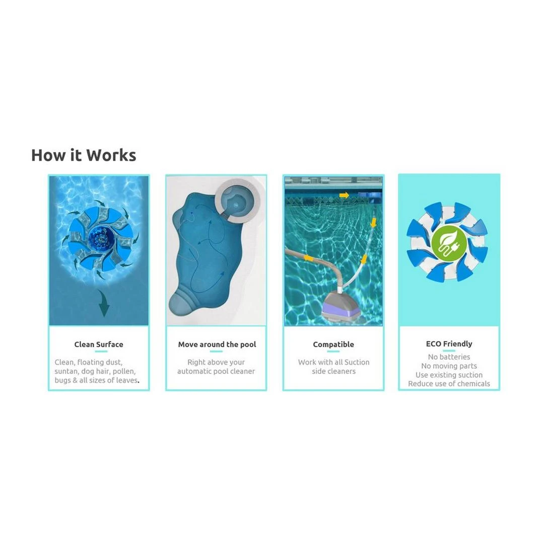 SkimmerMotion is the perfect accessory for any suction side pool cleaner! This pool surface cleaner includes adapters for all brands, including Zodiac, to universally connect to any suction side cleaner. The SkimmerMotion moves along with your cleaner, eliminating dust, bugs and small leaves from the water surface.